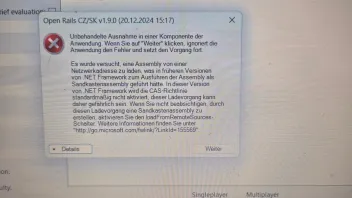 Jan, jetzt sagt mir das Installationsprogramm von Net.Framework, das bereits die aktuellste Version 4.8.1 auf meinem Rechner installiert ist, die Fehlermeldung mit dem Sandkastenassembly und der unerwarteten Ausnahme beim Starten von OR CZSK besteht aber (immer) noch.